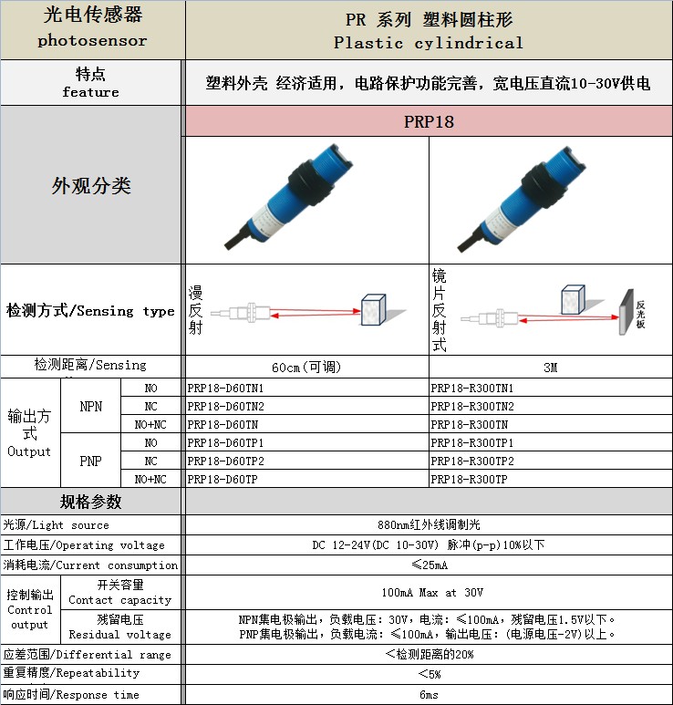 1.防護(hù)等級達(dá)到IP54(IEC規(guī)格) 2.緊湊的外形尺寸M18 3.漫反射型檢測距離能達(dá)到1M,偏光鏡面反射型檢測距離能達(dá)到3M 4.內(nèi)置靈敏度調(diào)整旋鈕(檢測距離可調(diào)) 5.抗相互干擾功能(鏡面反射型,漫反射型)